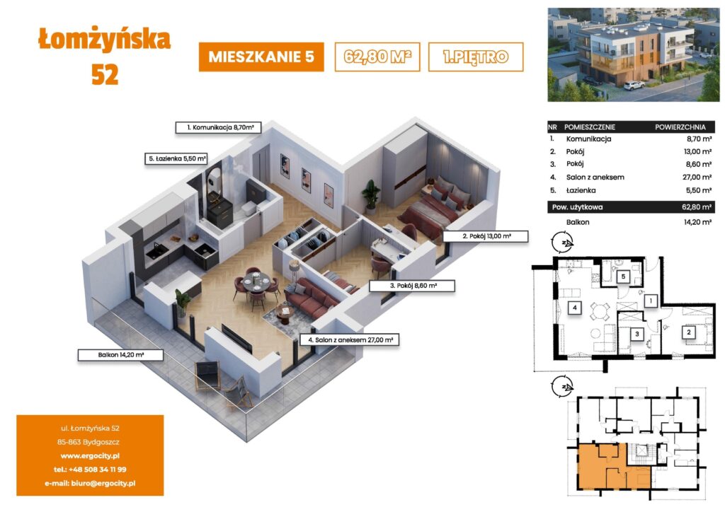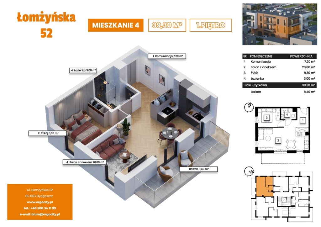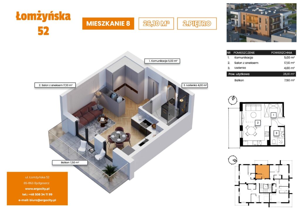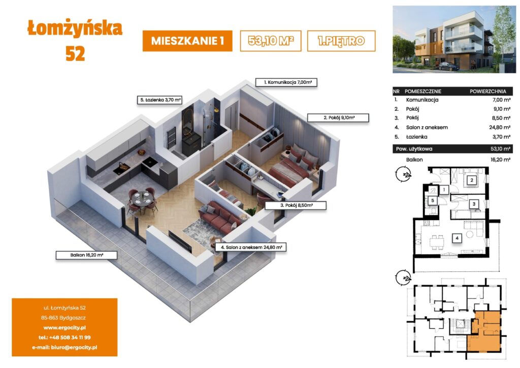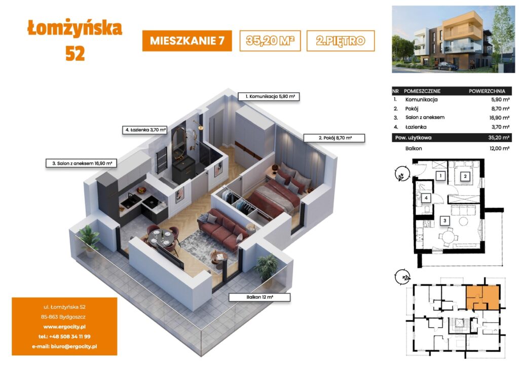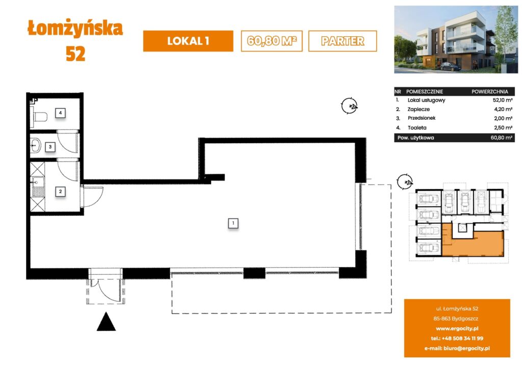 Inwestycja Łomżyńska 52 to wolnostojący budynek, który składa się z lokalu usługowego oraz 10 komfortowych mieszkań o zróżnicowanej powierzchni od 26 do 62 m2. Każde z nich jest wyposażone w przestronny balkon, a mimo niskiej zabudowy w budynku znajduje się także komfortowa winda. Dodatkowym udogodnieniem dla mieszkańców są jednostanowiskowe garaże naziemne, oraz 2 dodatkowe miejsca postojowe przeznaczone dla osób niepełnosprawnych.